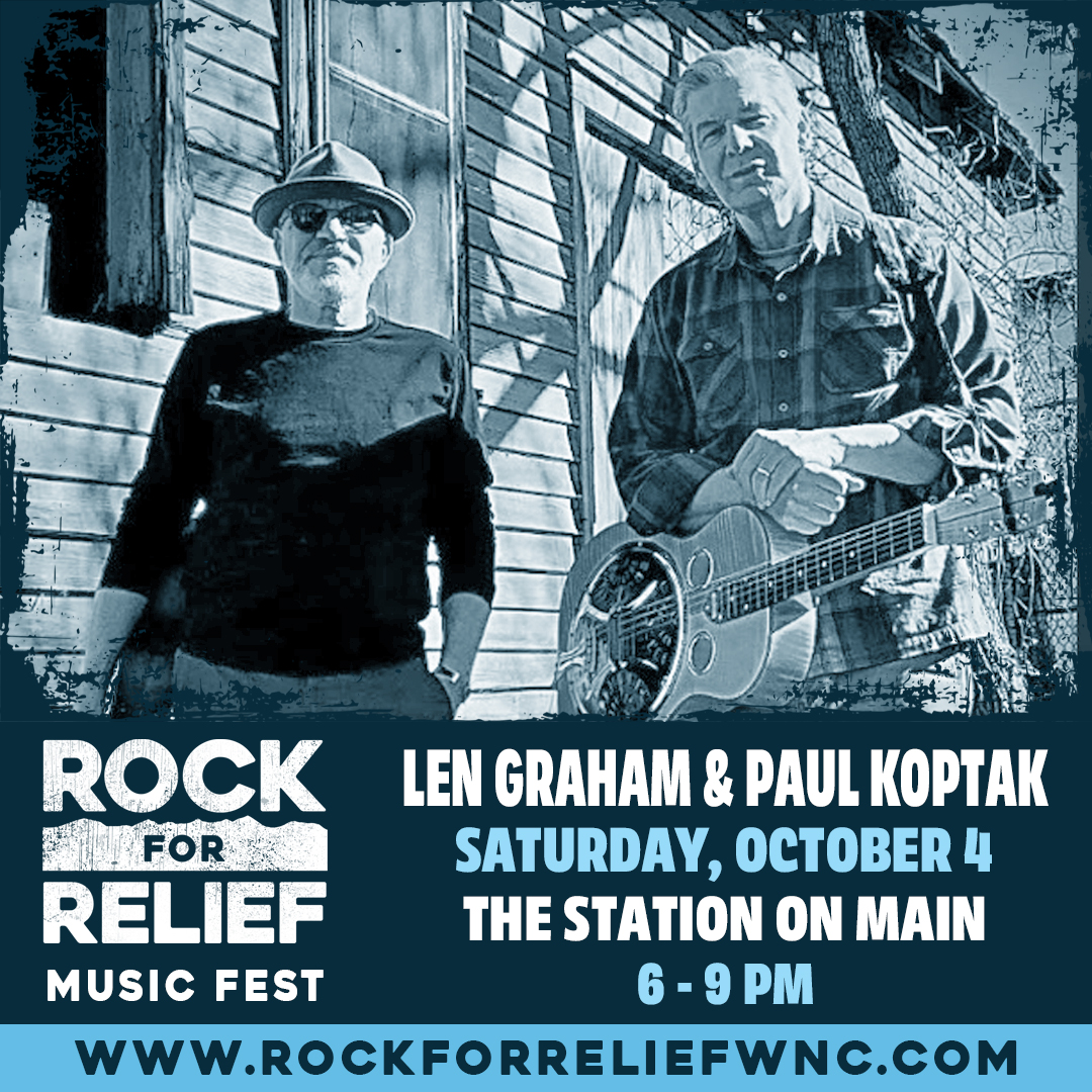 Join us on October 4th for Len Graham & Paul koptak: 6:00 – 9:00pm Rock For Relief WNC is an organization of WNC locals ALL donating our time and efforts to raise money for locals in need by hosting events with a heavy focus on LIVE MUSIC! Our ultimate goal is to bring people together […]